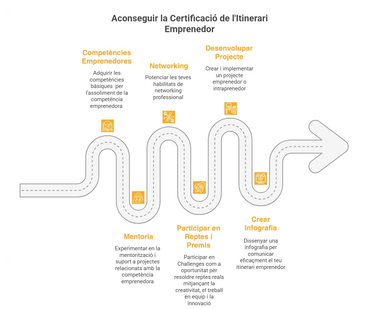 La Certificació de l'Itinerari Emprenedor et permet complementar la teva formació de grau a través de la participació voluntària en activitats extracurriculars, tant dins com fora del TecnoCampus, per adquirir competències en emprenedoria, innovació i intraprenedoria.