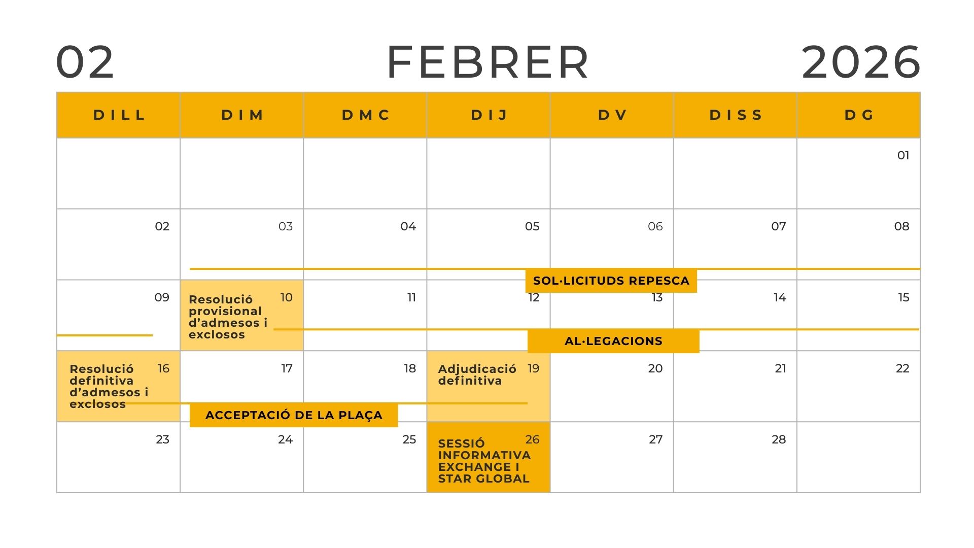 FES LA SOL·LICITUD AQUÍLa Comissió de Relacions Internacionals revisarà totes les sol·licituds i publicarà el llistat provisional d'assignacions el 16 de febrer.